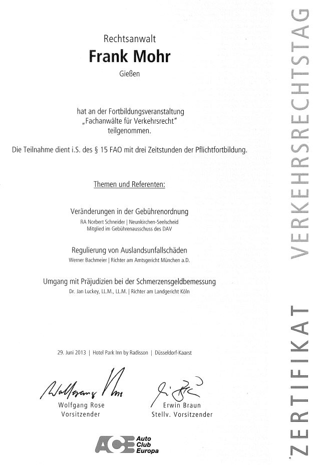 Fachanwalt für Verkehrsrecht seit Januar 2006.